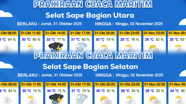 Pada wilayah Selat Sape Bagian Selatan, prakiraan cuaca menunjukkan dominasi kondisi berawan hingga hujan petir pada 31 Oktober, dengan suhu udara berkisar antara 24°C hingga 34°C dan kelembapan mencapai 73–86%.