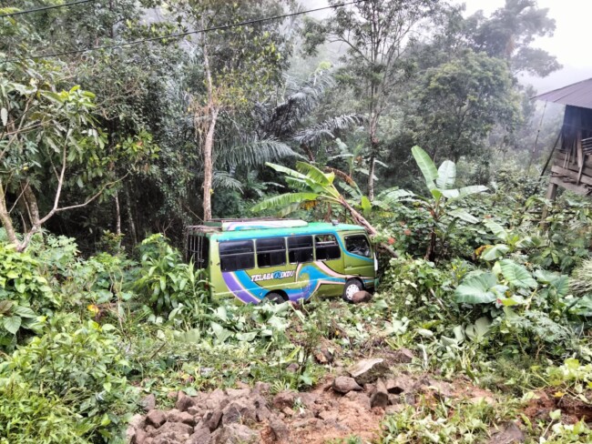 Satu unit bus Mitsubishi warna Pine Green Meta bernomor polisi EB 7247 GA terjun ke jurang setelah diduga sopir kehilangan kendali akibat mengantuk saat melintasi jalur menanjak dan menikung.