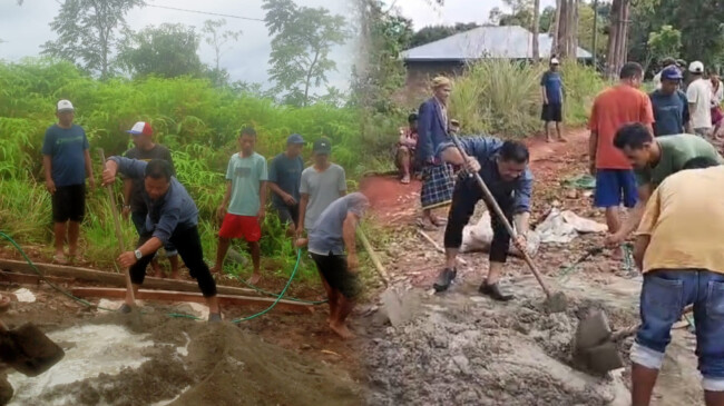 Perbaikan jalan dilakukan secara swadaya dengan metode rabat beton, melibatkan seluruh warga Kampung Jong.
