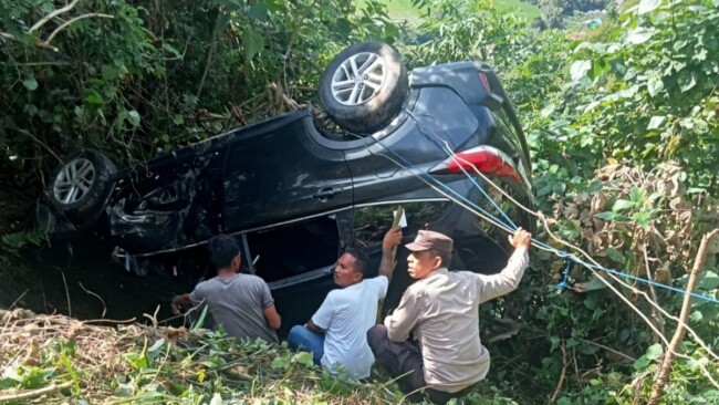 Kendaraan tersebut terperosok ke jurang setelah gagal menanjak di ruas jalan yang dilaporkan rusak parah.